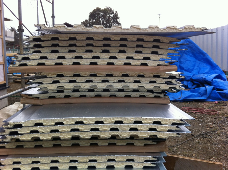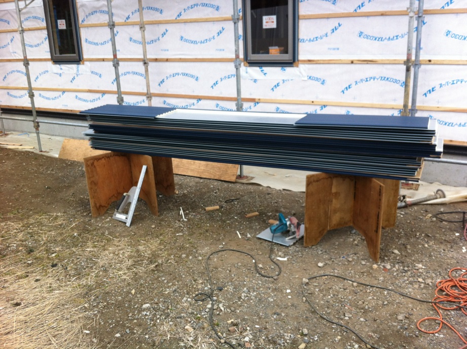 積み上げられたガルバリウムの板と、ギューンってなる、丸い刃ののこぎりが。