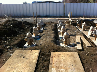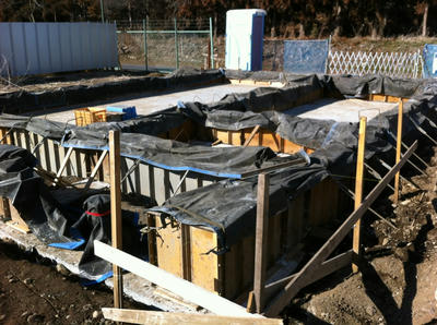 となりで一緒に現場を見ていた親父いわく、冬場はコンクリが固まるまでは凍らないようにシートをかけたりするとか。あとは凍る前に固めちゃうために、薬品を混ぜるとか。