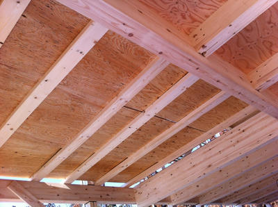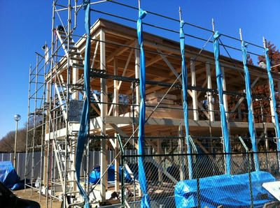 でもって、話をもどして日曜日の我が家なのですが、柱が立っていることにも驚いたのですが、上の写真の右端のほうなのですが、屋根の上に誰かいるのが見えますでしょうか。