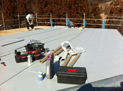 屋根のシートを貼っていらっしゃいましたww