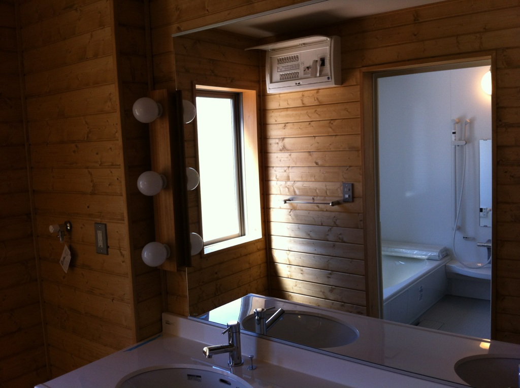 でもって、この鏡の両側にくっついてる、電球が3個(両側合計6個)の照明は、うちの奥様のこだわりなのですが、鏡がでっかいので、全体の印象的にコレにして正解でした☆
