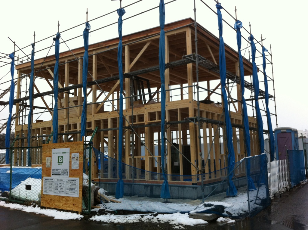 そんなミゾレ交じりの中、仕事の用事でカインズホームに行くことになったので、帰り道ついでに家を見に行って撮ったのが上の写真です。