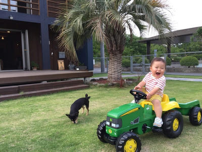 こないだのブログに書いたジョンディアのトラクターのおもちゃですが、うちの赤ちゃんは対象年齢よりも全然ちっちゃくて最初は全然乗れなかったのに、気づいたら自分で這い上がって、よじ登って乗れるようになってました☆