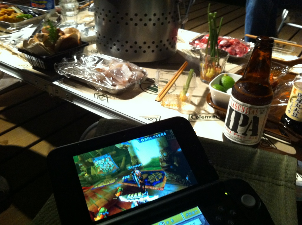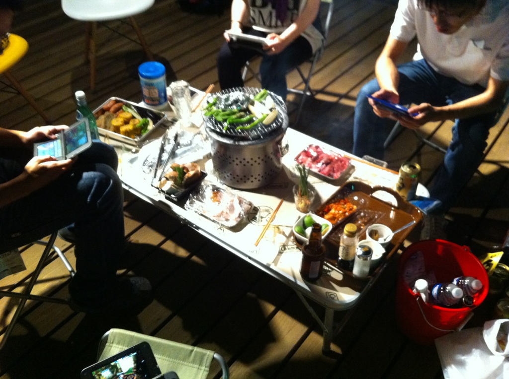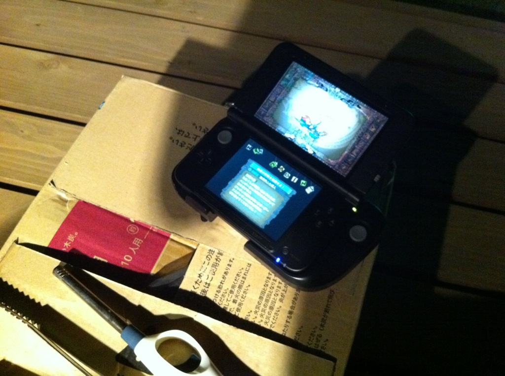 ちなみに僕は炭担当だったので、おつまみを食べるために箸を持つときは、こんな感じで炭の箱の上に3DSを置いてました。