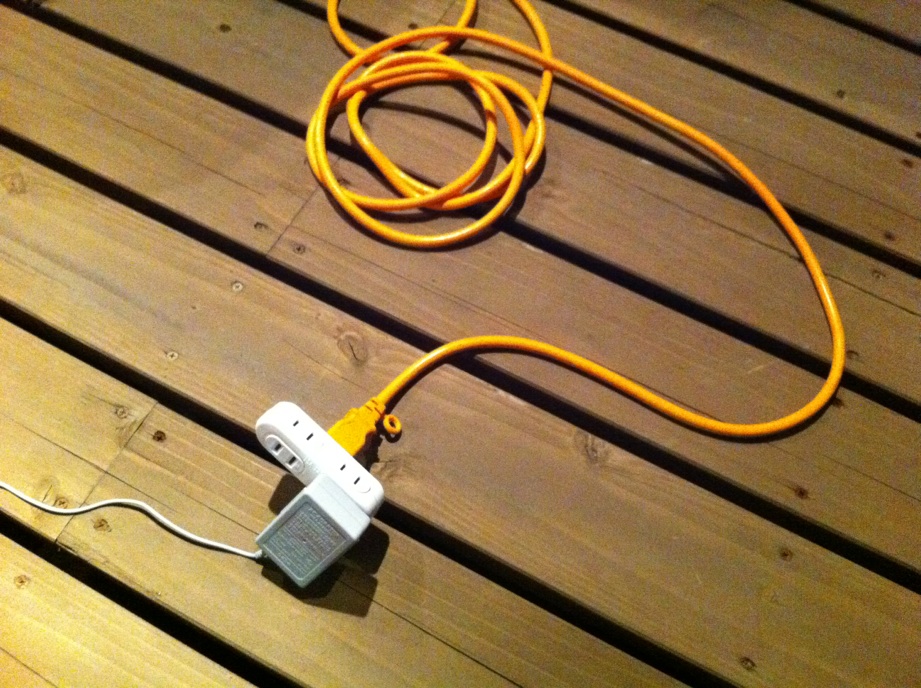 芝刈り機用の長~いコードに、友達が持ってきたタップをくっつけて使いました♪