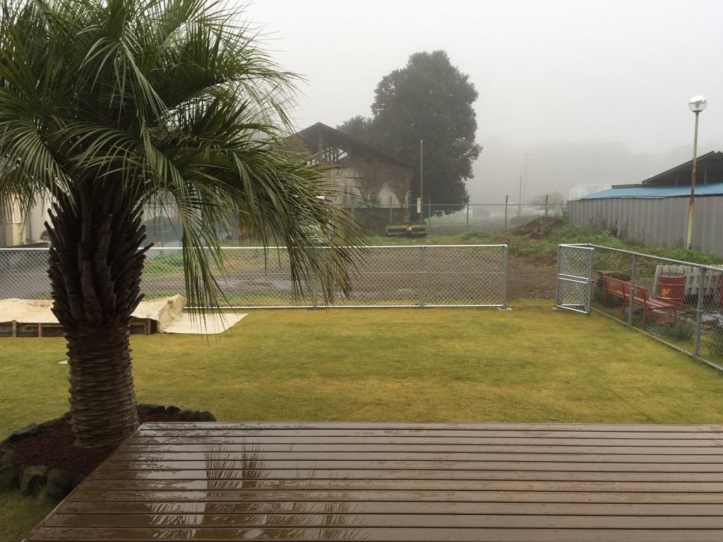 月曜日に仕事から帰ったら、家の南側のフェンスがついてました…が、暗くてよく見えなかったので、今朝出勤前に見てみたら… すごい霧ですwwじゃなくて、こんな感じで完成してました☆ 扉は片開きの内開きにしました♪この位置につけた理由は、畑のスペースに行きやすいようにです。でもって、物置の基礎のコンクリは… 雨対策でシートがかかってました。めくろうかと思いましたが、完成したときのお楽しみにとっておきました。デッキ側から見ると… すごい霧ですwwじゃなくて、こんな感じです☆以前の白い木の柵よりもしっかりしてるし大きいのですが、すっきりした印象です☆でもって、道路側からだと… すごい霧ですwwじゃなくて、こんな感じです☆周りをぐるっときっちり囲まれたので、芝生にココを出してももう安心です☆とゆーことで、フェンスは完成したので、あとは物置を設置するだけです。ただ、こないだ物置の販売店から連絡があって、物置が日本に届くのが12月前半らしいので、しばらくは待ちぼーけ確定です。でもまぁ、とりあえず年内に完成すればいいや。