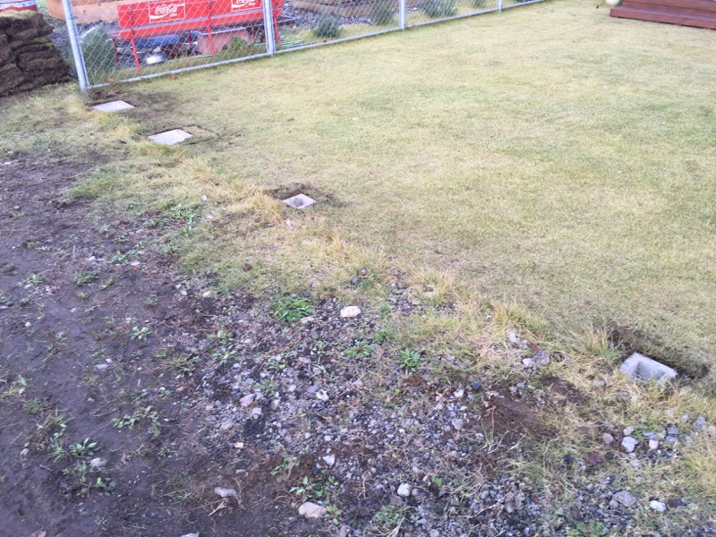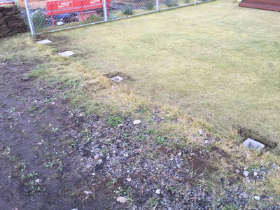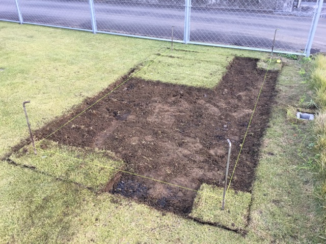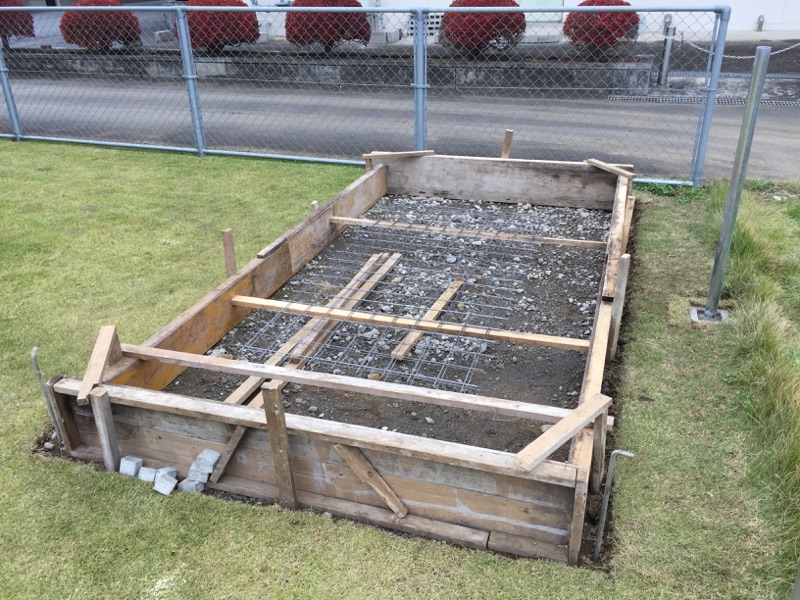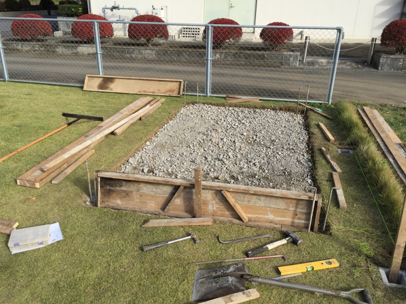 あ。察しの良い方でしたらお分かりかも知れませんが、この場所に物置を置こうと思っているので、フェンスをお願いしている土建屋さんに、ついでに物置の基礎を作ってもらうことにしたんです♪