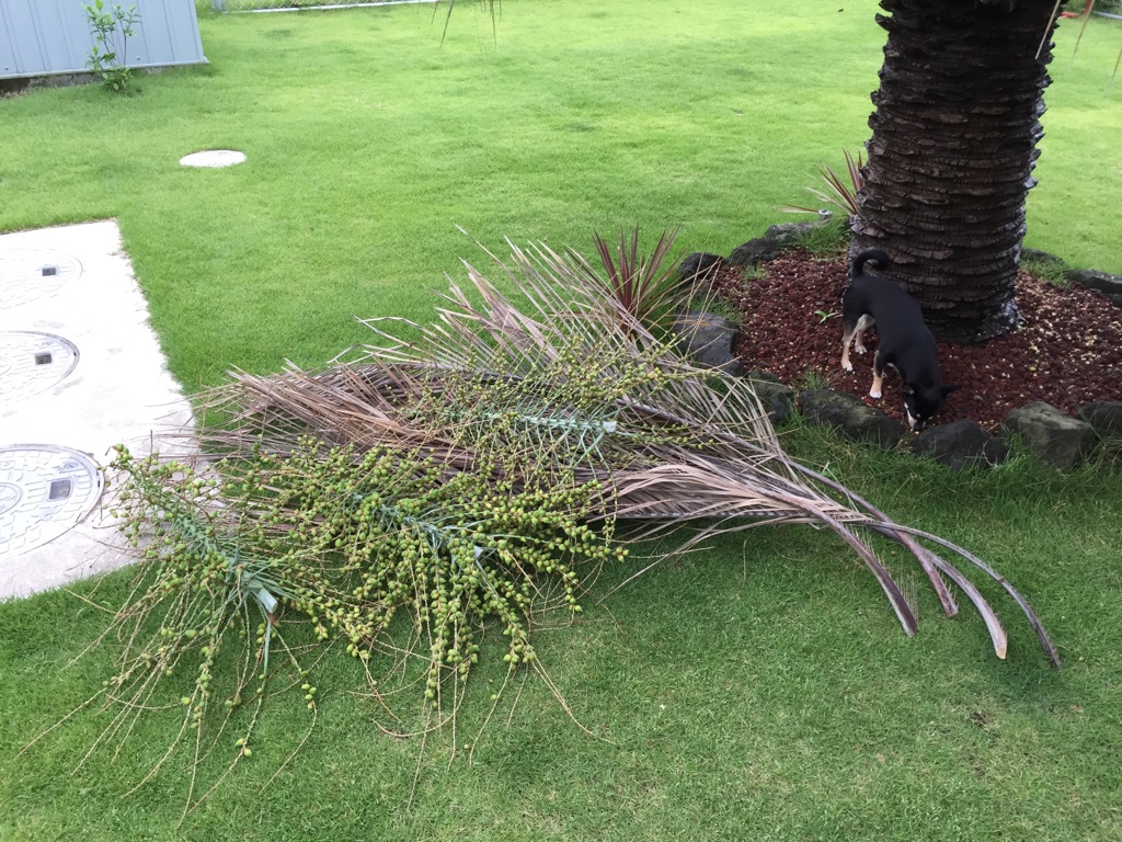 今年は空梅雨だったので、たまにヤシの木に水やりもしていたのですが、結構な本数の枝が枯れてしまったので、切り落としたとゆーわけです。