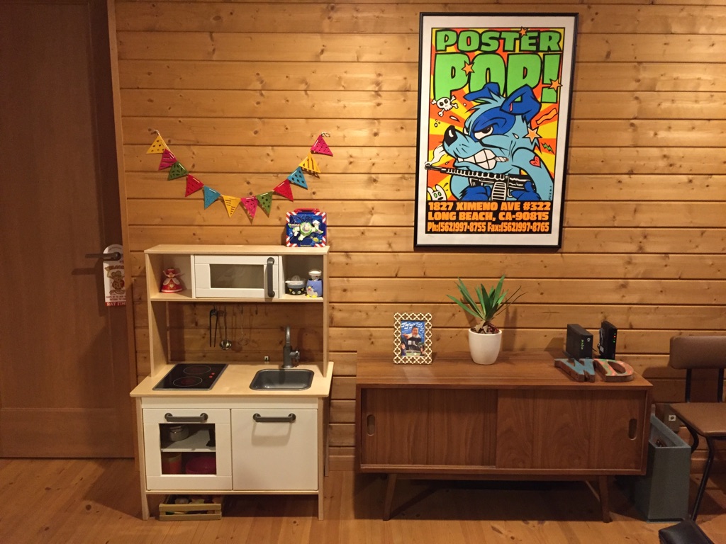 赤ちゃん用のサークルで囲ったスペースがあったのですが、イケアのおままごとキッチンを買ったので、子どもがおままごとキッチンにすぐに行けるようにサークルの柵を一か所外してたのですが、良く考えたらこれだったら柵はもういらないじゃんってことで、柵を撤去するついでに2階の子供部屋からカリモクのイスや、子ども部屋用に買ったテーブルなんかをもってきました。