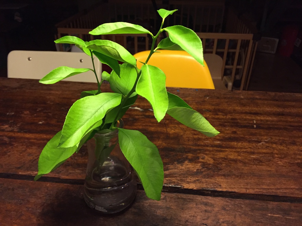 こちらなのですが、7月24日のブログに書きましたが、芝刈りをしていて庭のレモンの枝を折ってしまったやつを水にいけてあるのですが、まだまだ全然枯れる様子がなく、葉っぱも青々としています☆